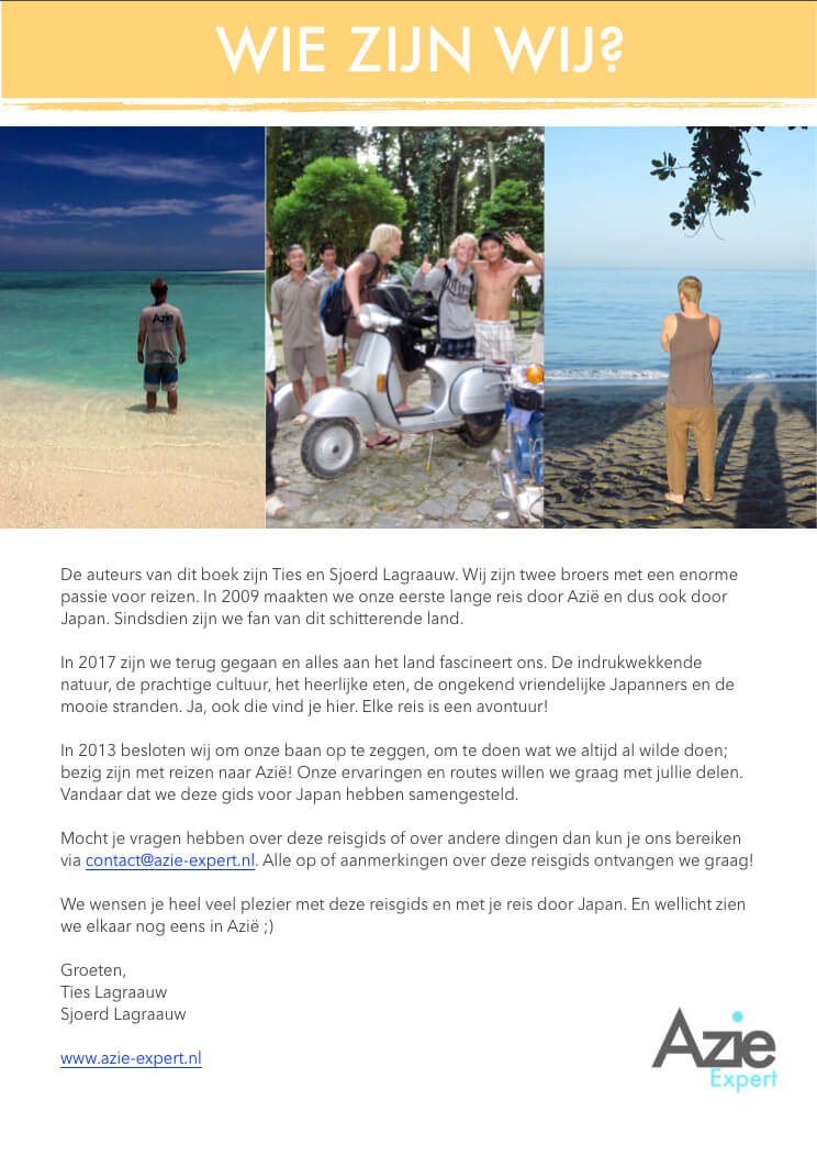 Onze reisgids Japan hebben we opgesteld met de intentie om andere reizigers te helpen. We kunnen stellen dat we behoorlijk ervaring hebben qua reizen in Japan. Maar daarnaast hebben we ook veel tips en info gekregen van onze bezoekers op de website. Het boek helpt je met:
