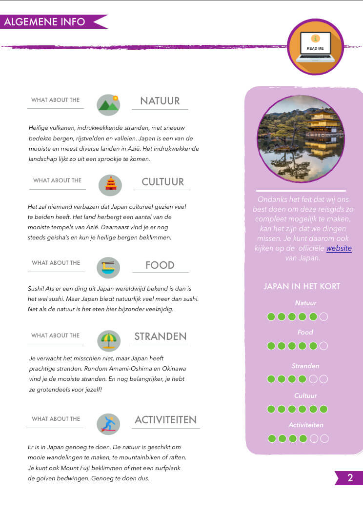 Ook alle kennis van onze website, ruim 100 pagina’s aan informatie over Japan hebben we verwerkt in onze reisgids. Daarnaast is de reisgids digitaal verkrijgbaar. Met de digitale versie kan je hem makkelijk onderweg lezen op je telefoon, iPad of laptop.
